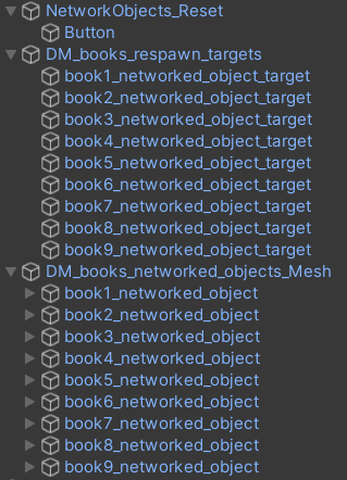 <figure><img src="https://2640392766-files.gitbook.io/~/files/v0/b/gitbook-x-prod.appspot.com/o/spaces%2F5yxYHsXtlAaoMUrDWhLm%2Fuploads%2Fgit-blob-2216681ea84be0929240b4556642e3c9580a9037%2Fmulti_button_reset_hierarchy.png?alt=media" alt=""><figcaption><p>Example hierarchy of network objects and game objects to define their reset transforms</p></figcaption></figure>