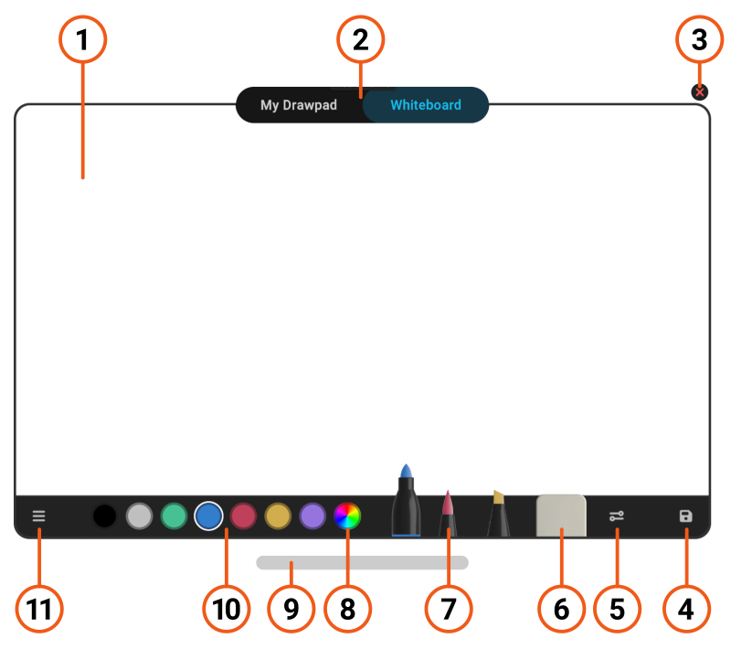 <table><thead><tr><th width="118">Label</th><th width="166">Feature</th><th>Description</th></tr></thead><tbody><tr><td>1</td><td>Canvas</td><td>The area where you create your drawing.</td></tr><tr><td>2</td><td>Tabs</td><td>Switch between your personal Drawpad and a public whiteboard, if connected.<br><br>If the Drawpad isn't connected to a whiteboard, you can use the Whiteboard tab to connect to a whiteboard or create a whiteboard IFX.</td></tr><tr><td>3</td><td>Close</td><td><strong>Desktop and mobile devices only</strong><br><br>Close the Drawpad.<br><br><strong>Note</strong>: To close the Drawpad on a VR device, tap the Drawpad icon on your wrist controls.</td></tr><tr><td>4</td><td>Save</td><td>Save an image of the currently selected tab.</td></tr><tr><td>5</td><td>Tool options</td><td>Open a settings panel for the currently selected tool.</td></tr><tr><td>6</td><td>Eraser</td><td>Change the brush to an eraser that paints the background color.</td></tr><tr><td>7</td><td>Pens</td><td>Choose from three different pen types.</td></tr><tr><td>8</td><td>Color picker</td><td>Set the color of the currently selected palette slot.</td></tr><tr><td>9</td><td>Drag bar</td><td>On VR devices, grab this bar and drag to move the Drawpad. You can drag any area around the edge of the Drawpad.</td></tr><tr><td>10</td><td>Color palette</td><td>Select and configure multiple palette slots.</td></tr><tr><td>11</td><td>Menu</td><td>Access menu options for the Drawpad.</td></tr></tbody></table>
