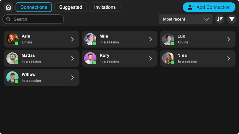 * **In a Session**: Open your menu or tablet, and then select the **People** <img src="https://3460182399-files.gitbook.io/~/files/v0/b/gitbook-x-prod.appspot.com/o/spaces%2FwVx6bvwqEE7tD0TYOcfj%2Fuploads%2Fgit-blob-99f3aaebf416ad1425da01bcd6545b7b5c1c0f60%2Fmenu_i_users.png?alt=media&#x26;token=25212cd0-be92-4395-86df-4a3238a43d10" alt="" data-size="line"> page. Here you can view and create connections with people in the Session, view your current connections, and manage your invitations.
