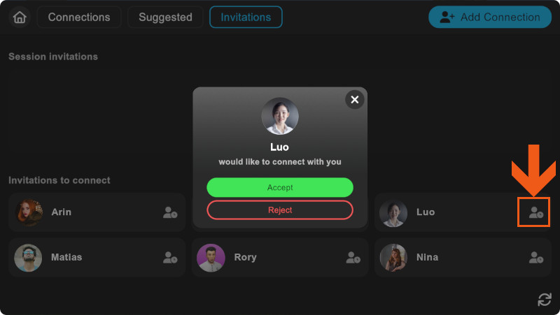 Option to respond to an invitation to connect, and the accept or reject panel that it causes to appear