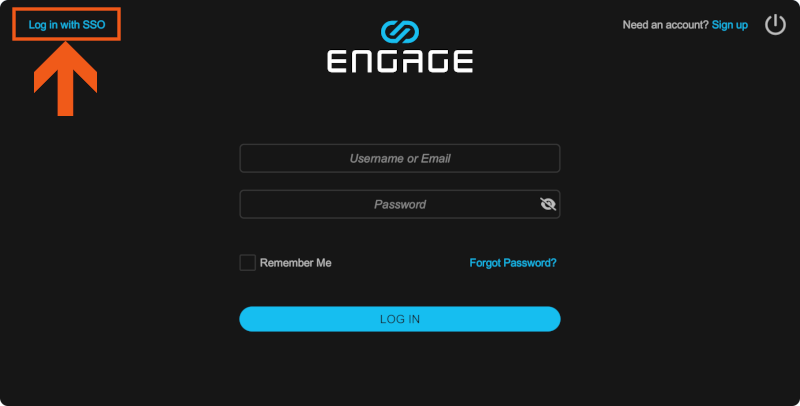 <figure><img src="https://3460182399-files.gitbook.io/~/files/v0/b/gitbook-x-prod.appspot.com/o/spaces%2FwVx6bvwqEE7tD0TYOcfj%2Fuploads%2Fgit-blob-cafc62c938347f35ed11dd60798efc2c35b521da%2Fsso_log_in_app.png?alt=media" alt=""><figcaption><p>Option to log in with SSO in the ENGAGE application</p></figcaption></figure>