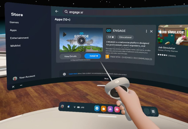 To install ENGAGE on a Meta Quest headset, use the Quest Store. To do this while wearing the headset, complete the following steps: