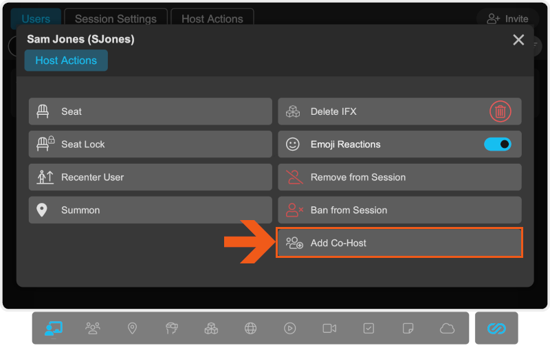 You may want to assign another user as co-host to guard against unexpected technical issues. For example, if you are the only host in a standard Session, and you lose your network connection, everyone else in the Session is returned to the menu screen.