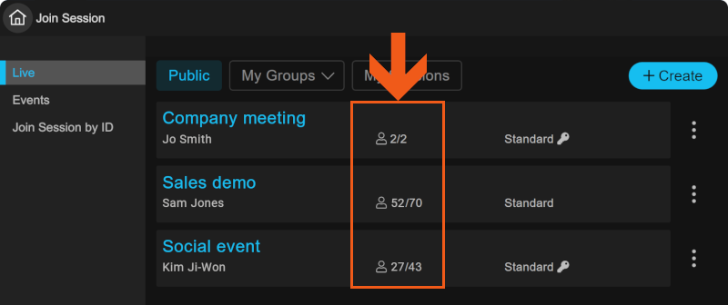 In the ENGAGE application, the current number of users in a Session and the maximum capacity are shown in multiple places. For example, in the list of Sessions and on the top bar of the menu when in a Session.