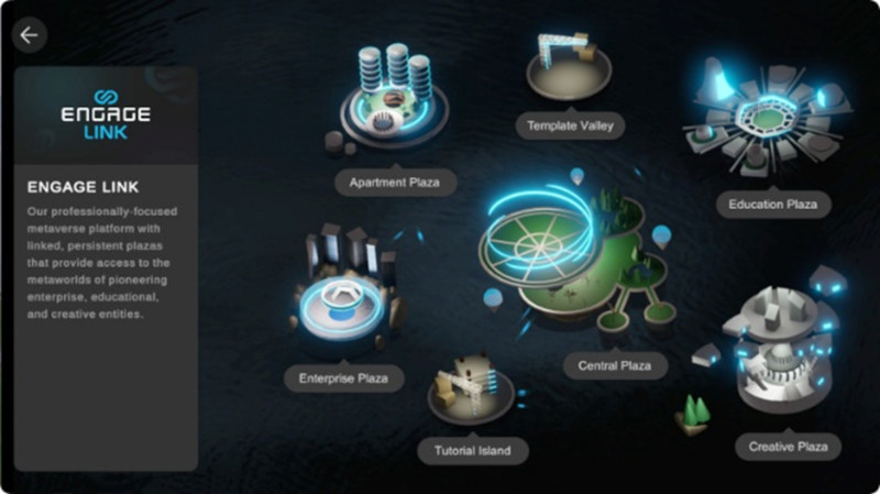 ENGAGE LINK is our professionally focused metaverse platform with linked, persistent plazas. Users can access a map of these plazas, and other LINK spaces, from both the application menu screen and in-Session menu. From the map, a user can choose which space they want to visit, and then interact with other members of the public who are in those spaces.