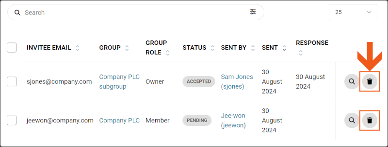 * To view invitations for a specific group, select **Groups** from the side menu, select the **View** icon for the group that you want to delete an invitation from, and then select the **Invitations** tab.